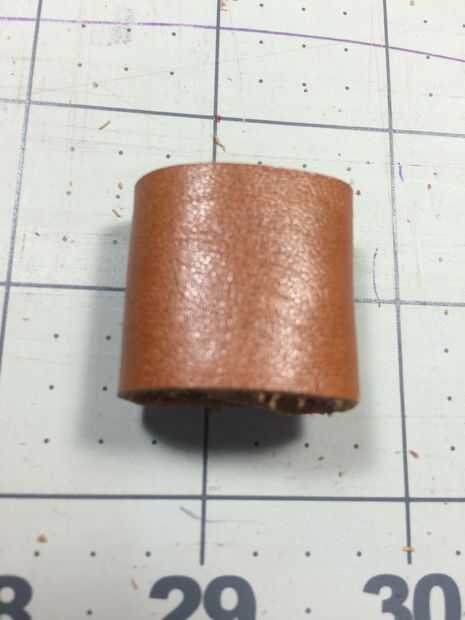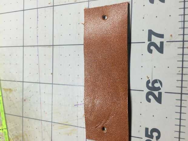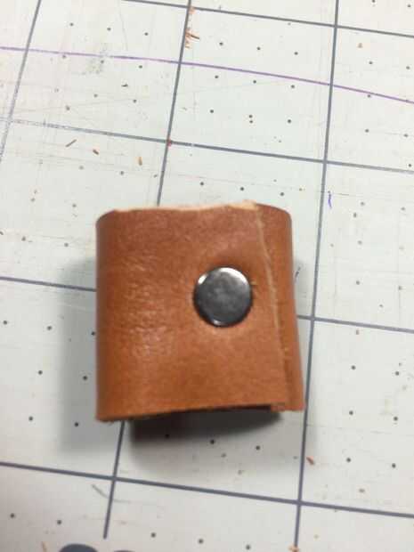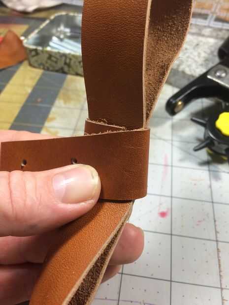 Tome un pedazo de cuero de 1/2 pulgada a 1 pulgada de ancho dependiendo de su estilo y Envuélvala alrededor de un doblado sobre el cinturón y superponerse aproximadamente 1/4 pulgadas (alrededor de suficiente espacio para un agujero y remache) y marque y corte allí. Este proceso da sala a la diapositiva final etiqueta perfectamente bajo la torre del homenaje instalado. Ya que no se ajuste mucho debe ser bastante apretado allí. Marcar y perforar los extremos e instala un pequeño remache para hacer el anillo.