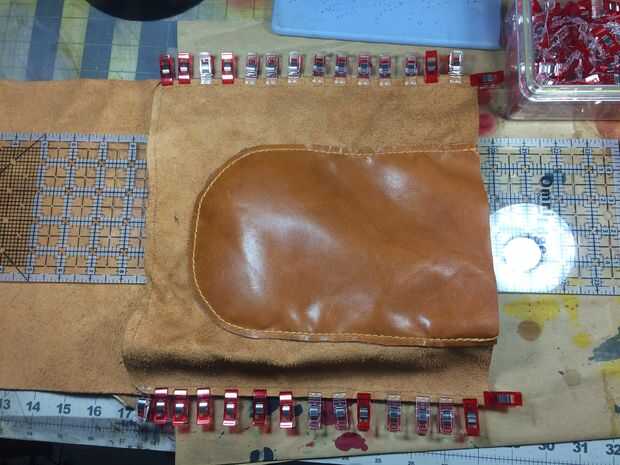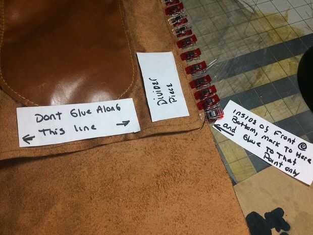 En este momento marca de donde termina la pieza de divisor en la parte inferior del interior de la parte delantera. (si tiene sentido) sólo se pegue a este punto. Ver fotos. El divisor es un poco más amplio para dar cabida a un libro o un objeto se coloca detrás de él. Y no se asegura la parte inferior para impedir que la puntada de marcas que aparecen en la parte exterior de la bolsa. Después de aplicar el pegamento instrucciones mfg, cuidadosamente asegure la pieza de separador en su lugar asegurándose de que orientar el pequeño bolsillo apertura hacia arriba. Utilizar clips para mantenerlo hasta la curación. Usted será no ser coser esta parte hasta que usted instale la escuadra