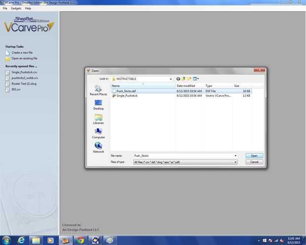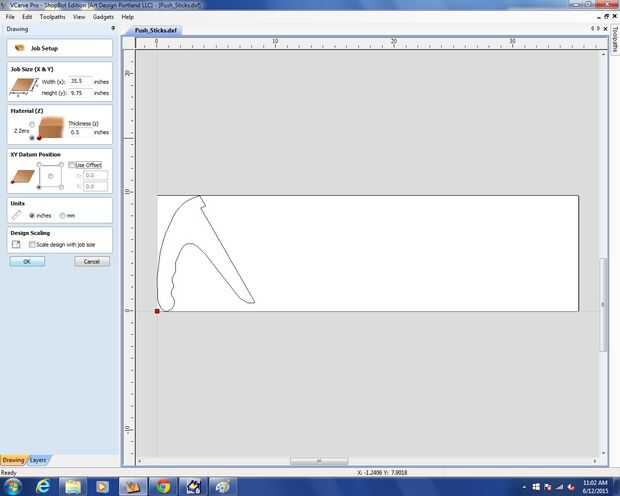 -Abrir Push_Sticks.dxf en VCarve Pro Set información: dimensiones X e Y de material o las dimensiones de cnc todo no cama grueso de material 0 sobre la mesa desplazamiento