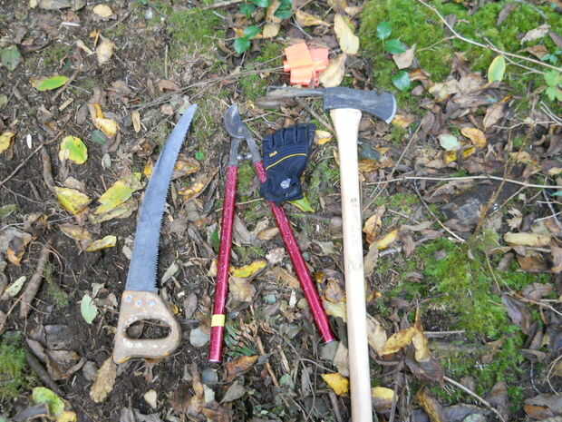 Para este pequeño tramo de camino utiliza una sierra de mano loppers y a pulaski.  El pulaski no es mi favorito pero creo que es el más fácil de encontrar en tiendas.  Además de que es un multiusos de la herramienta, así que si tienes que caminar largas distancias a donde usted va a trabajar, será capaz de tener un hacha y una azada.  Cualquier azada funcionará bien, pero no recomendaría una pala para el trabajo de sendero.  El mango largo se pone en el camino, además de palas no son la mejor herramienta para suavizar el suelo.  Los guantes son también una necesidad.  Te ayudarán a mantener un buen agarre en el mango y protege las manos de conseguir ampollas o espinas en ellos.