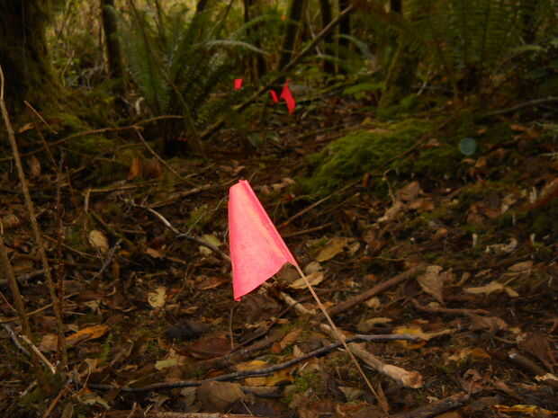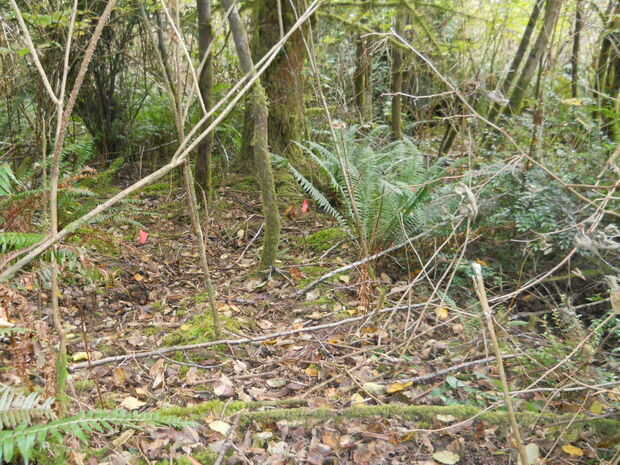 Primera cosa a hacer es dar un paso atrás y ver como se trabaja con.  Para tener una idea de posibles rutas puede diseñar indicadores.  Camine alrededor y ver sólo lo que se siente derecho.  Recuerde, no crear trabajo extra para usted.  Ir alrededor de los árboles en lugar de recortar hacia abajo.  Aquí creo que se ejecute el camino hacia abajo y girar a la derecha, antes del árbol más grande.  Se trata de la sección que se centrará.