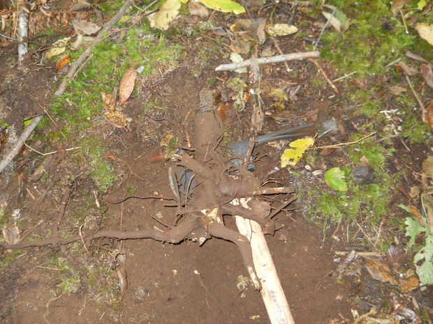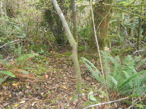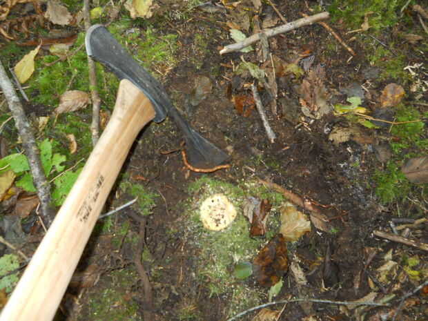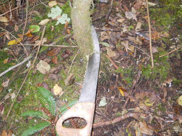 Ahora quitar cualquier cosa más grande con su sierra.  Como dije, me gusta salir tanto como puedo, pero aquí había un pequeño árbol que se inclina sobre el camino.  Ser conscientes de dónde caerá cuando usted corta.  Incluso un pequeño árbol puede lastimar si te pega.  Ahora deberás eliminar el tocón.  Utilizar al pulaski y cavar alrededor del tocón (salvando la suciedad) y empezar a cortar las raíces hasta que tira de gratis.  Puede tomar un poco de trabajo.  Ahora llene el agujero detrás con la suciedad.