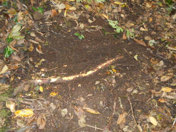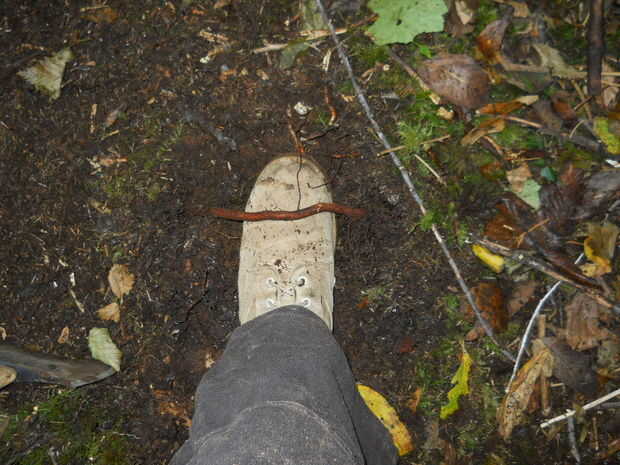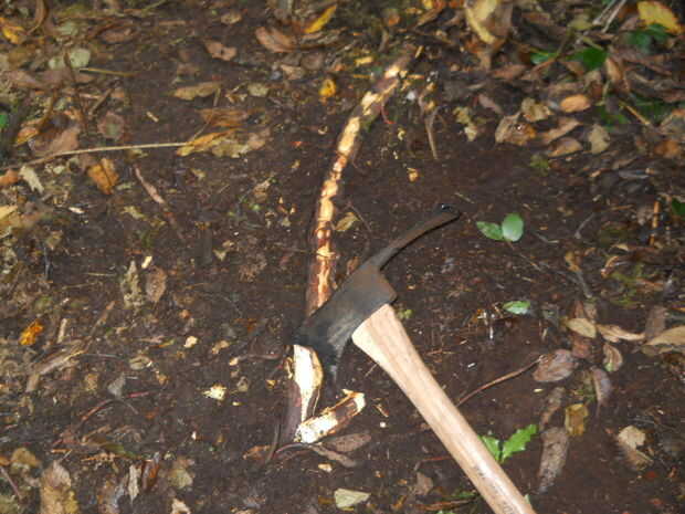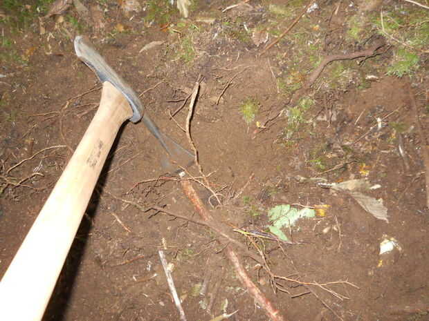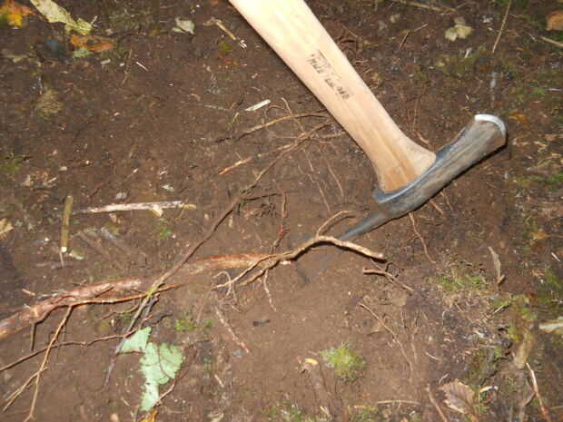 Ahora puede comenzar a eliminar las raíces.  Esto es a menudo pasado por alto por gente haciendo mantenimiento de camino.  Cuando es pisado un rastro, cualquier hojas y agujas de pino se consigue embaladas abajo.  Después de un tiempo raíces pueda ser expuestas.  Al construir un sendero, raspe la capa podrida para ver las raíces.  Que se los saque tajada justa a cada lado.  Es fácil y realmente mejorar la pisada de un sendero.