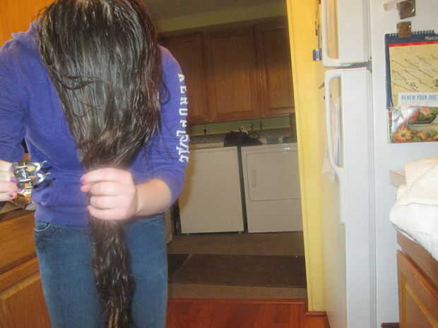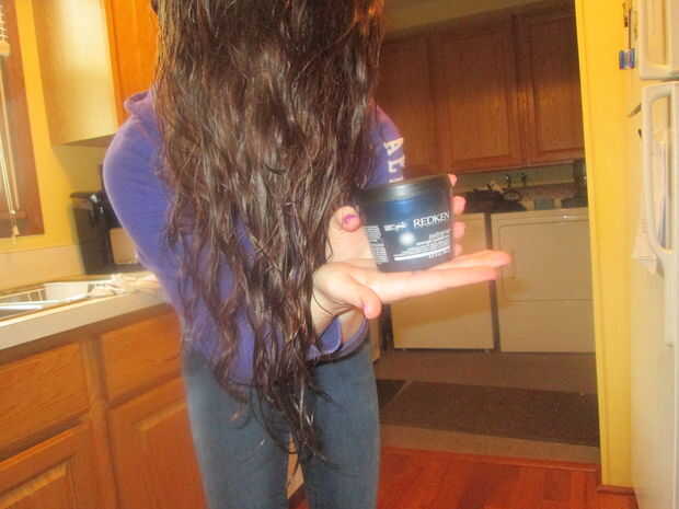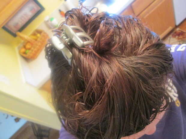 Después pongo esto en mi pelo, pelo todo mi pelo encima de mi cabeza en un moño flojo. Entonces, lo dejo reposar unos 45 minutos a una hora en mi cabello.