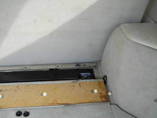 Después de se gira la tapa del piso de carga, usted verá sobre 7 círculos negros a lo largo del borde en la parte trasera de los asientos. Estas son las cabezas de los clips de presión manteniendo la parte posterior de las cubiertas de asiento. Estos tendrán que ser removidas muy cuidadosamente.