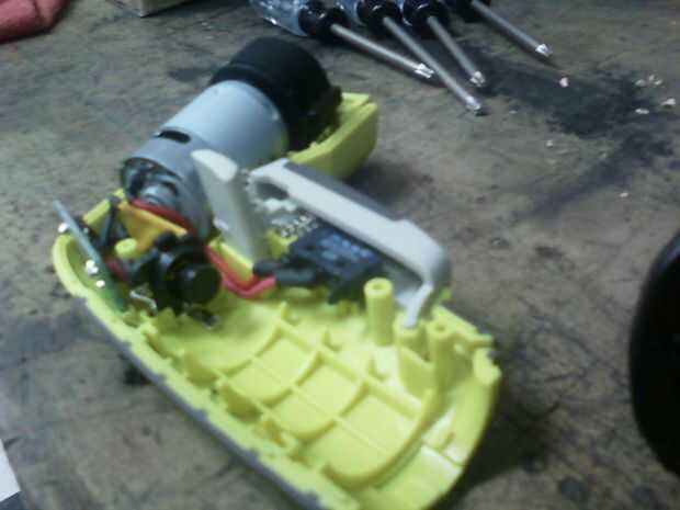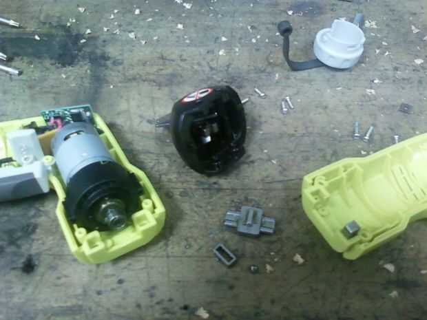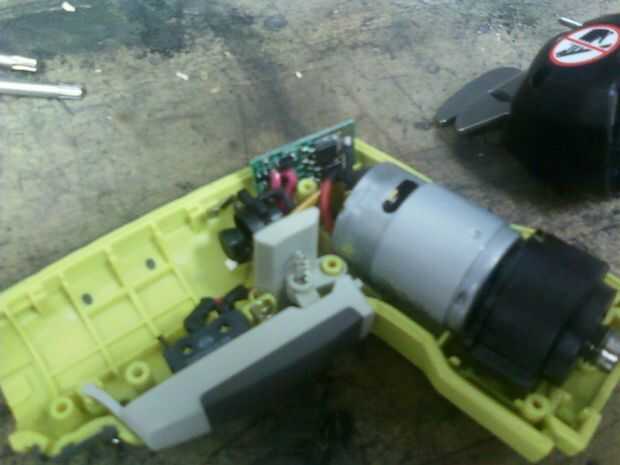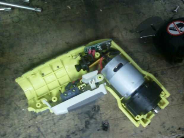 Ahora puede ver el funcionamiento interno de la herramienta, el motor, una placa de circuito, el mecanismo que cambia el movimiento de rotación en movimiento lineal, la seguridad y el gatillo, etc.. Estamos preocupados acerca de cómo funciona la seguridad, y qué parte de ella necesita ser modificada para mantener fuera de nuestro camino. Bajo una inspección más cercana, que funciona en forma muy similar a otros interruptores de seguridad de Ryobi, con sólo un diseño ligeramente diferente. La herramienta en sí, sin embargo, debe tener algunas cosas en un cierto orden para volver juntos muy bien.