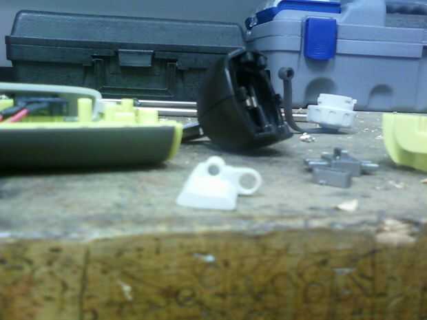 Así que ahora que la seguridad se quita de la herramienta, es momento de retirar la parte segura de la seguridad para hacer la herramienta más útil. Se puede ver en el cuadro amarillo qué parte del interruptor y la interfaz de seguridad, y a su vez es lo que tiene que ser quitado de la seguridad.