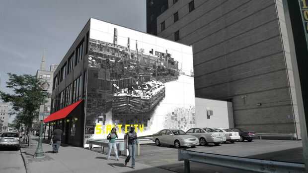 Para elegir una imagen que puede ser "pixelado" en una imagen que es todavía legible, requiere de una imagen con relativey siluetas claras. En otras palabras, la imagen debe ser capaz de ser abstraído en un estado casi icónico. Durante este proceso, queríamos una imagen que habló sobre el sitio en particular, que estaba adyacente al Canal de Erie. El Museo del Canal de Erie fue lo suficientemente amable para abrir sus archivos de foto. Repasamos literalmente cada fotografía en el archivo de factibilidad, elegir un pequeño puñado que luego probados por desonfocar para ver cómo quedaría que tanto cierran para arriba y desde lejos. Finalmente, la imagen seleccionada se realizó en una representación realista que había aproximada de cómo sería el mosaico de código QR.