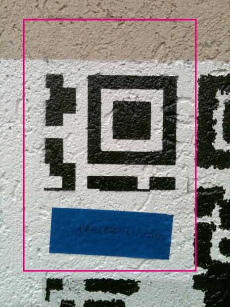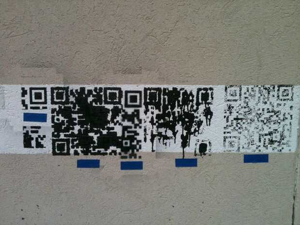 Nuestro próximo paso fue poner a prueba diversas técnicas pictóricas. Código QR debe estar bastante clara, con aproximadamente el 30% contraste para ser legible con la mayoría de los teléfonos que hemos probado. Hicimos una serie de pruebas de pintura sólo para ver cómo articular podríamos hacer los bordes de la pintura. Hubo dos metas competencia: hacer el QR códigos tan claramente como sea posible mientras que lo que nos permite pintar tan rápido como sea posible. Pruebas incluyeron varios materiales de laercut así como lo en última instancia eligieron: un vinilo corte plantilla que temporalmente se frotó sobre la pared. Una vez se frotó el vinilo en la pared, hemos pintado con spraypaint y finalmente retirar el vinilo. Se probaron otros métodos de pintura tales como pintura con un rodillo, pero en última instancia el spraypaint sobre transferencia de vinilo era el método más limpio y más rápido.
