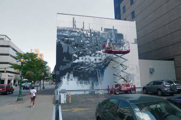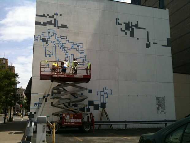 instalación de wall Street para crear murales interactivos que puede ser edificada y revueltos con el tiempo.Componentes de la mezcla de GraffitiRed: La rejilla de cuadrados se componen de igualmente en piezas de madera con imanes conectados por un l