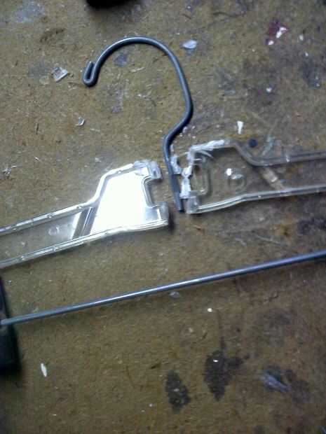 Para obtener la pieza de metal, debe separar el cuerpo de suspensión plástica del gancho de metal. Esto es bastante simple y podía hacerse algunas maneras, pero mi manera favorita era simplemente romper los ganchos con un martillo. Una duro golpe, situado sobre la intersección de gancho claro plástico y de metal, fue suficiente para la mayoría de suspensiones, aunque algunas necesitan un poco más convincente.