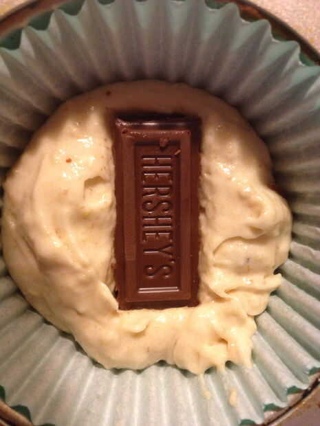 Relleno Magdalena 1/4 lleno, entonces puso un trozo de chocolate en el centro y poner suficiente masa encima para cubrir el chocolate. El revestimiento no debe ser más de 3/4 completo.