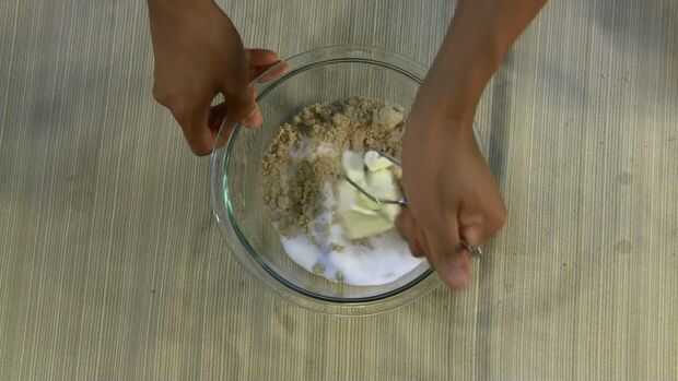1. derretir la mantequilla en el microondas y mezclar todos los ingredientes de la corteza, hasta que la mantequilla se distribuye bien y crea una textura grumosa.