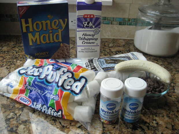 esto no es una forma fácil hornear receta para un día caluroso de verano.Todo lo que necesitas es:Un paquete de galletas4 malvaviscos gigantesPudín de Chocolate instantáneoChips de chocolatePaso 1: corteza de galleta De la corteza sólo tendrá 3 bombo