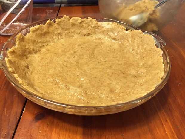 Luego tomar el plato de pastel y spray Pam (o el equivalente en aerosol). Dividir la masa de la corteza por la mitad (una mitad de la corteza inferior/exterior, el otro es para la parte superior) y presione la parte inferior/exterior la mitad en el plato de pastel; fijar el otro lado, como que se utilizará en un paso posterior.