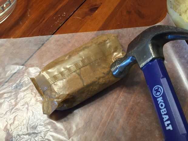 Ahora agarra el martillo (o la herramienta machaca galleta preferida) y machacar encima de las galletas. He encontrado que uno de los paquetes es aproximadamente una taza de migas. Una vez han aplastado las galletas, mezclar las migas en la masa de la corteza hasta que se forme bolas.