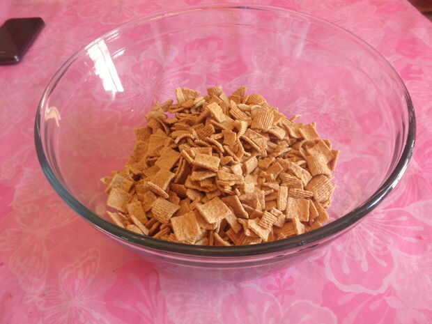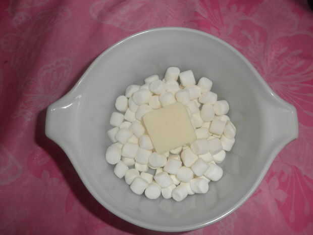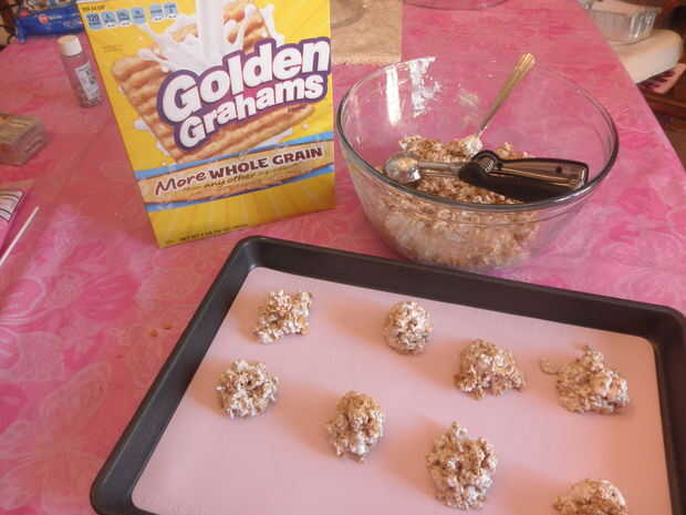 Derretir los malvaviscos y la mantequilla en el microondas durante aproximadamente 1 minuto revuelva bien. Luego se mezclan en el cereal bien. (va a ser muy pegajoso, pero que es mitad de la diversión) dejó establecido para unos 15 min scoop en bolas con su cucharada de galleta. (si quieres que puede engrasar con mantequilla)