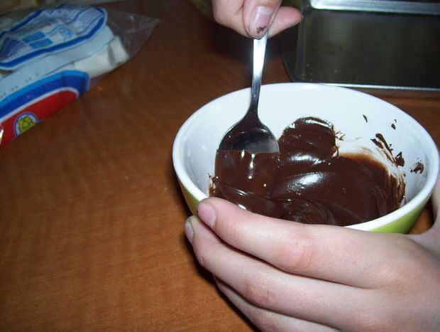 Vierta los chips de chocolate en un recipiente y microondas 40 segundos. Revolver. Si el chocolate ha no se derrite totalmente, microondas otra vez durante 10 segundos y luego revuelva, repitiendo hasta que esté todo derretido.