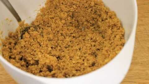 Combine todos los ingredientes de la corteza en un tazón pequeño hasta que se asemeja a la arena húmeda que se pega junto. Ponga a un lado.