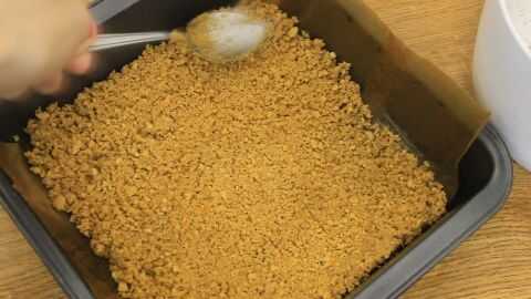 Línea un molde cuadrado de 8' con pergamino o papel encerado (como se muestra en la imagen) y rociado con aerosol de cocina antiadherente. Añadir la corteza y extensión uniformemente, suavemente presionando con las manos o una espátula.