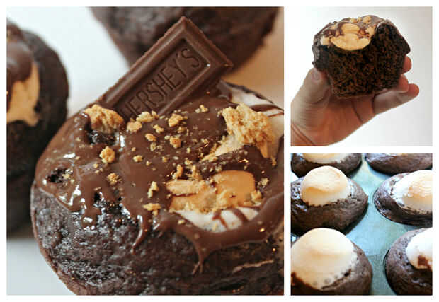 Utilice una caja de pastel de Chocolate para tus cupcakes, pero sólo les llene 1/3 completo. Aplasta un malvavisco en el centro de la masa y hornear hasta que el malvavisco se ve ligeramente tostadas (como en la imagen)