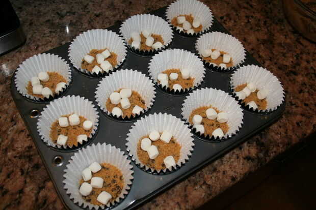 Cupcakes de s ' Mores - corteza de galleta, pastel de chocolate oscuro, migajas de galletas graham en la parte superior de la torta, tostado glaseado de malvaviscoCrear una 'costra' combinando las migas de galletas graham, la mantequilla y el azúcar.