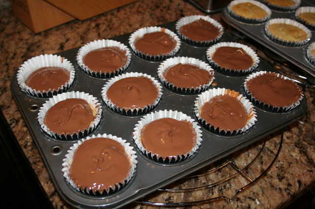 Derretir el resto de los chips de chocolate mini en una caldera doble.  Una vez que el chocolate se haya derretido, sacar una cucharada en los cupcakes aún caliente, asegurándose de extenderlo uniformemente sobre la parte superior de la Magdalena.  Una vez más, no dude en añadir más chocolate Si usted así lo quieren, pero prometo que es bueno como-es.  No sacarlos de la sartén todavía.