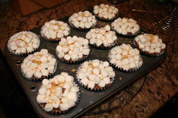 Opcional: Si tiene un soplete de cocina lujo y deseo el ' marshmallow quemado fogata auténtica mirada, sostener cuidadosamente la llama unas pulgadas por encima de la parte superior de las magdalenas hasta que los malvaviscos estén dorados a la perfección, asegurándose de no encenderse los malvaviscos o papeles pintados/capa. No añadir la guarnición de la galleta triturada hasta después de este paso, o te quemarse las partículas de la galleta, que no es tan delicioso.