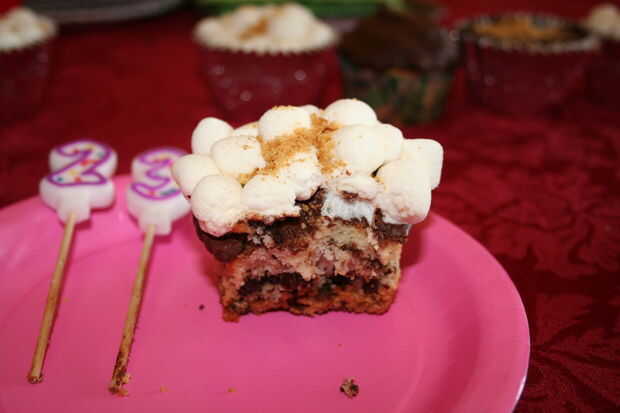 Cupcakes de s ' Mores - corteza de galleta, pastel de chocolate oscuro, migajas de galletas graham en la parte superior de la torta, tostado glaseado de malvaviscoCrear una 'costra' combinando las migas de galletas graham, la mantequilla y el azúcar.