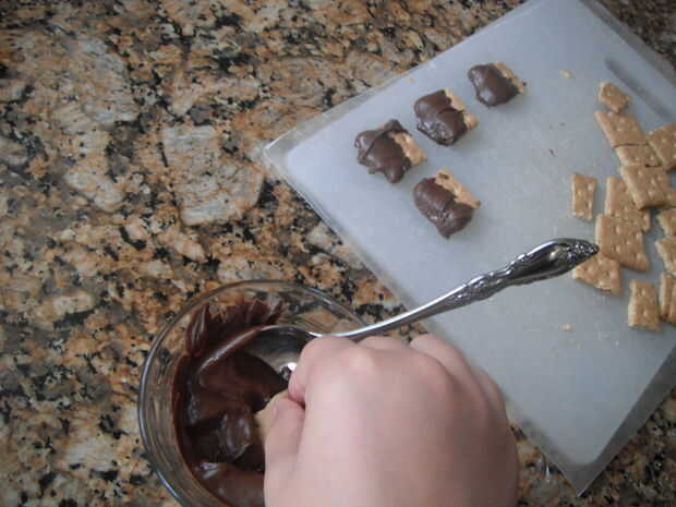 Derretir el recipiente de chocolate poniendo el microondas por 20 segundos, removiendo, luego repetir hasta que los trocitos de chocolate se derritan. Sumergir las galletas en el chocolate y ponerlos en el congelador durante 8 minutos. (Esto realmente funciona)