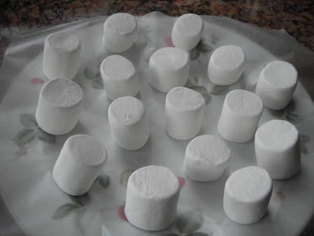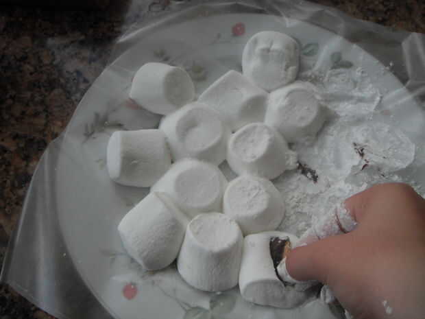 Utilizar el número de bombones que usaste para ellos galletas. Poner en el microondas durante 25 segundos cubren los dedos en el azúcar en polvo o harina. Insertar cada una de las galletas en el centro de un malvavisco y luego rodar en las nueces picadas, azúcar en polvo, salpicaduras o cualquier otra cosa que desea. ¡ Disfrute!