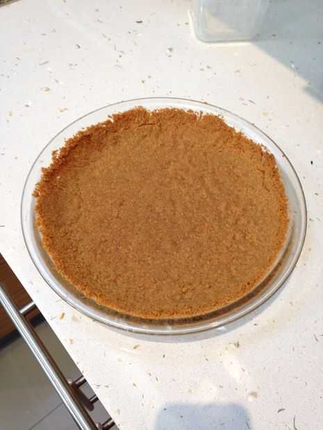 Romper las galletas y colocarlas en un procesador de alimentos. Pulso hasta que las galletas son finamente molidas. Añadir mantequilla y continuar mezclando hasta que la mezcla esté homogénea. Presione la mezcla en una tartera de 9 pulgadas. Hornear durante 15-20 minutos hasta que estén doradas. Dejar de lado que se enfríe.