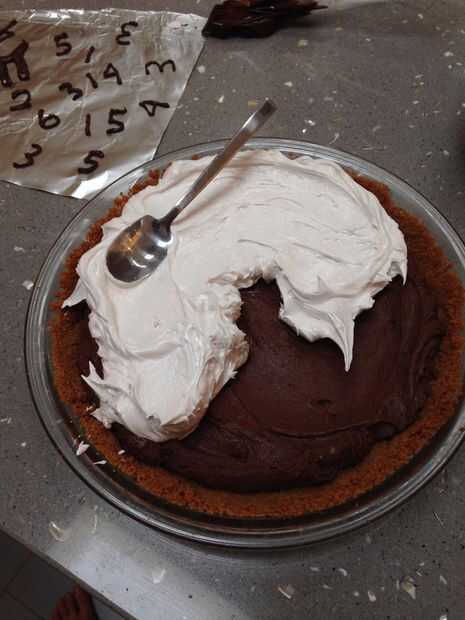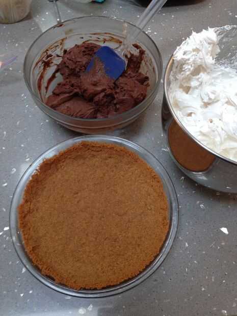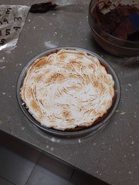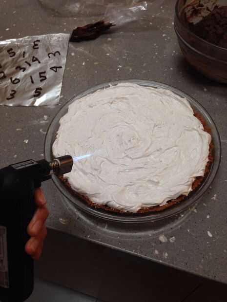 En la corteza de galleta prebaked, capa sobre el relleno luego el relleno de malvavisco de chocolate. Use una linterna para obtener marrón la pelusa de la melcocha y poner la tarta en un asador de 3-5 minutos.