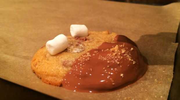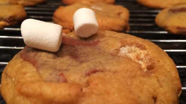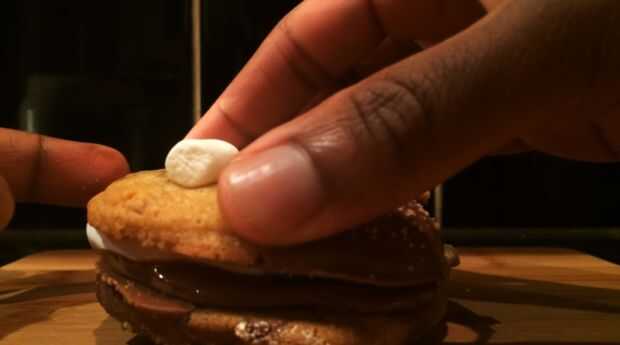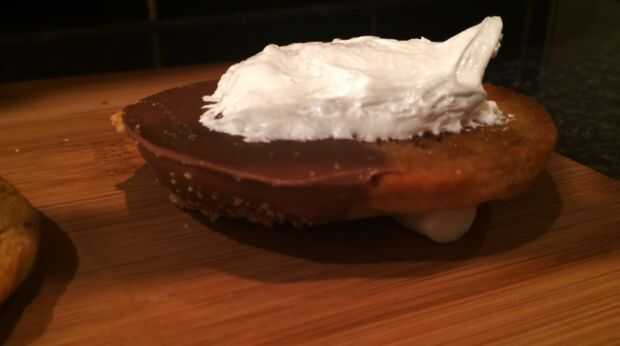 Mientras se enfría, coloque unos mini malvaviscos encima de las galletas. Una vez completamente frío, fundir el chocolate y sumergir en la mitad de cada galleta. Coloque las galletas en algunos papel de horno y espolvorear en algún picado biscuits(Graham Crackers) digestivo. Una vez seco, voltee las cookies y difundir la pelusa escaria de chocolate y malvavisco en la parte inferior de cada cookie y sandwich junto.