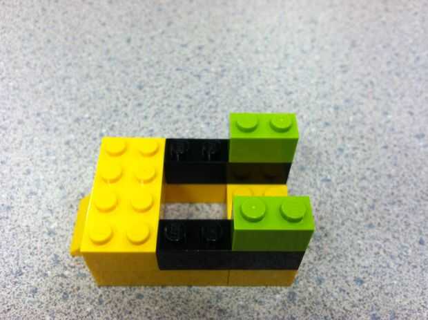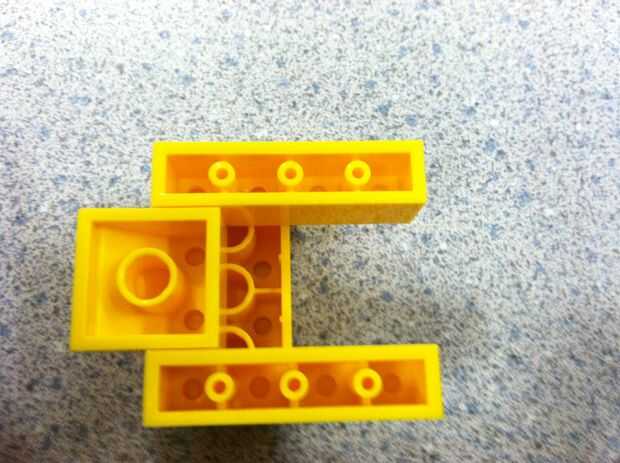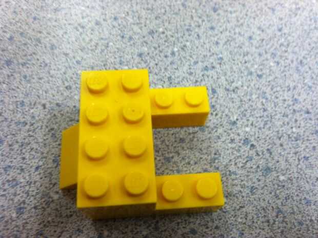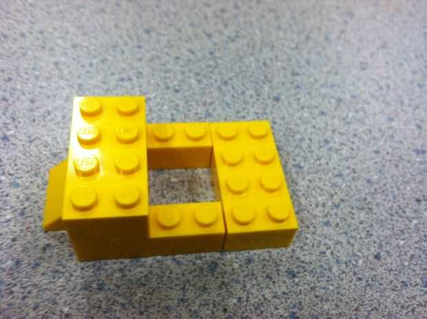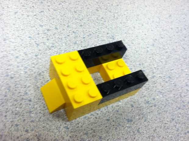 2. para conectarlos, coloque un bloque amarillo 4 x 2 sobre el final con el pico en el centro como se muestra en las fotos #3 y #4.
