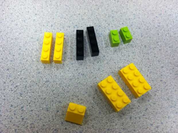 Para construir el motor, necesita bloques de 4 x dos 1 amarillas, dos 4 x 1 negro bloques, bloques de dos 2 x 1 verde, bloques de 4 x 2 amarillo y pico de 2 x 2.