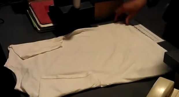 Paso 1: Doblar la camisa por la mitad, asegúrese de que los gráficos en la camiseta son visibles.Paso 2: (Doblar)Paso 3: En la parte donde no se muestra el diseño de la rueda para arriba. No liar la parte gráfica ayuda a identificar la camisa de una