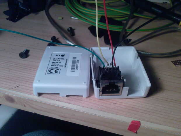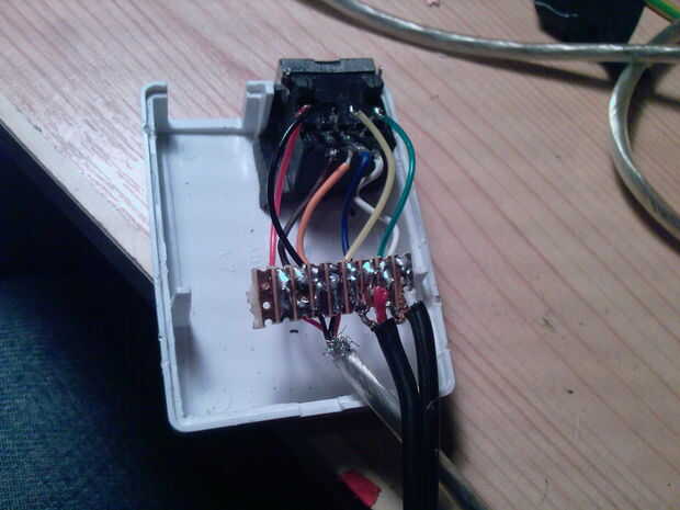 Paso 1:-utiliza un poco de cinta doble cara espuma para pegar el terminal RJ45 en el cuadro. Originalmente intentó conectar los terminales de la misma forma que tenía en el extremo de la PC pero me pareció que trabajando en el cuadro apretado así que había despojado de un poco de cable de red y había soldado al terminal RJ45.