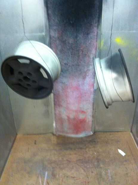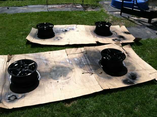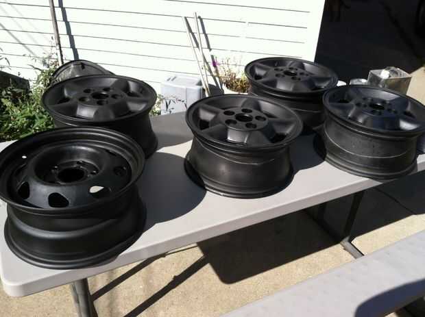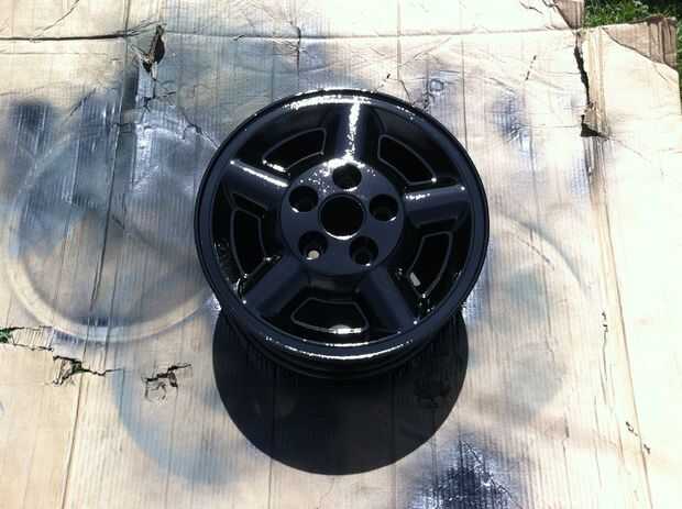 Después de que fueron (por fin!!!) con chorro de arena, mi intención original era powdercoat mis llantas negras. Tuve negro plano de puerto de carga elegido hacerlo. Me pasé una horas de buena pareja pulverización las llantas individualmente, pero la cobertura no era muy buena. Después de la inspección, la pintura de polvo no había hecho la mejor funda protectora que esperaba, dejándome pintar sobre ellos. Yo les daba una arena áspera y pintada luego con un negro que tenía en el garaje.