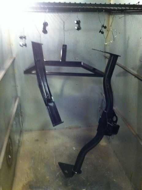 Una vez que se había secado la imprimación, tiro el enganche e inserte con la pintura negra para emparejar los bordes y colóquelo a un lado para secar. después de darle una o dos horas para secar, tomé hasta Techshop y cocido al horno la pintura en su horno de powdercoating. La pintura en su horno de curado había secado lo rápidamente por lo que podría ponerlos en el carro al día siguiente. Pintura tiene 30 días completos para curar totalmente, incluso ya en frío, Techshop me permitió curar en aproximadamente una hora.