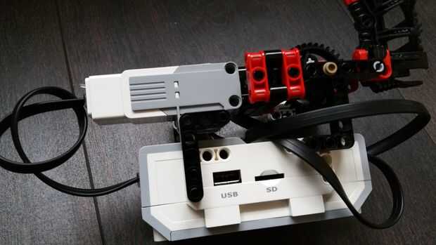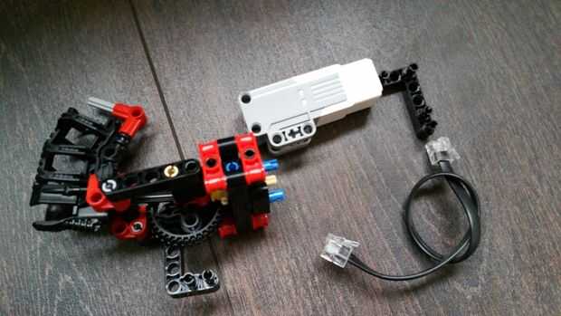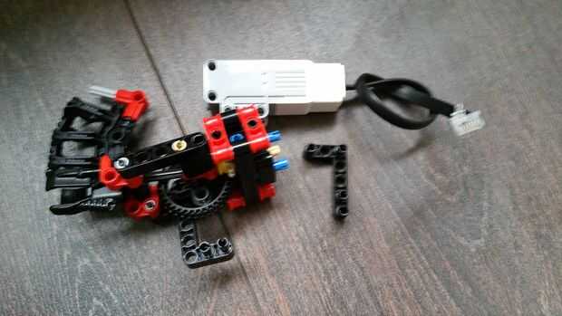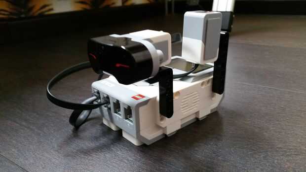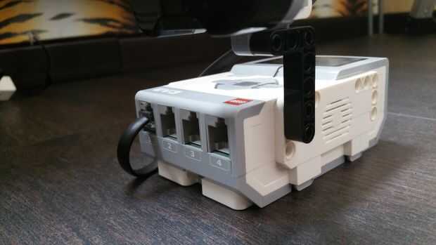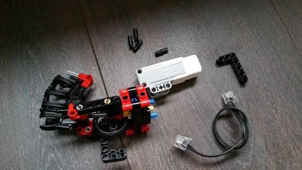 Esta es la parte principal. Básicamente es todo lo que necesitas. Consiste en el ladrillo de EV3intelligent, al cual até el mecanismo de disparo y los 2 sensores.