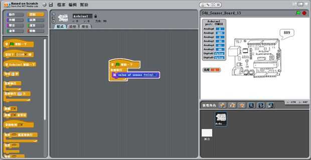 S4A Sensor Board 的光源控制器是透過 D3 或 A1 腳位引出, sesión 在這個 的學習課程, 光源感測器與電位器 (可變電阻) 一樣, 都是利用類比埠輸出, 輸出值介於0 ~ 1023。