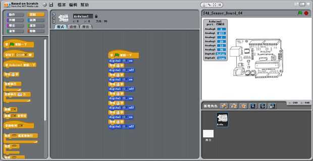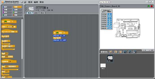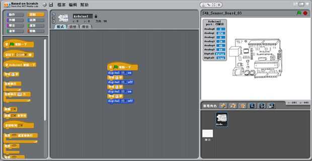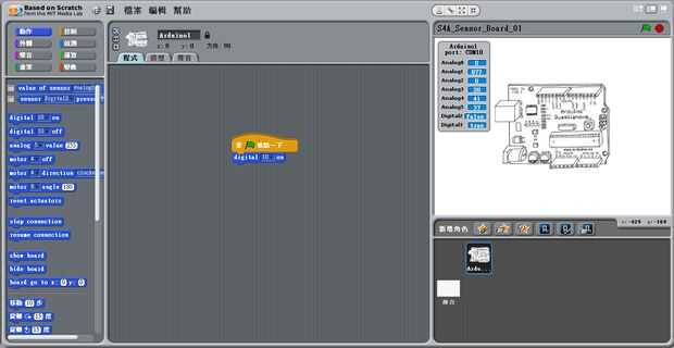 按下綠旗執行程式, 讓S4A Sensor Board 的紅色 LED 燈(D10) 亮起來