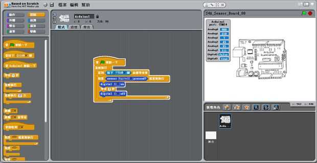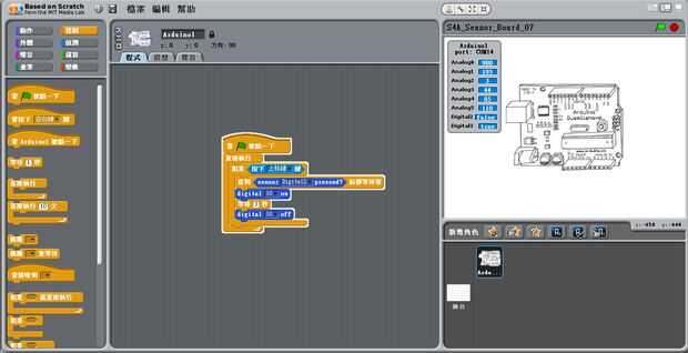 請您利用 S4A 中的「偵測指令」積木, 操作 S4A Sensor Board的按鍵與LED燈。