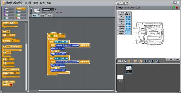 按下鍵盤的「上移鍵」, 啟動執行動作:按下按鍵 (D2), 啟動 S4A Sensor Board 的紅色 LED 燈(D10) 亮起來, 等待3秒後熄燈。