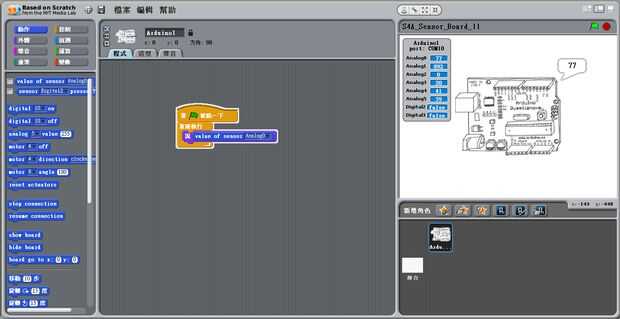類比埠的輸出值是0 ~ 1023。 在S4A Sensor del tablero shàng, 類比埠除了應用在RJ11的擴充腳位上, 在板子上也預設使用3組類比埠, 即 A0:電位器 (可變電阻) 、A1:光源感測器(也可透過D3 PWM) 、A2:麥克風。 從這個 sesión 開始, 我們要練習電位器的控制與應用。