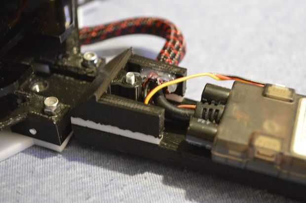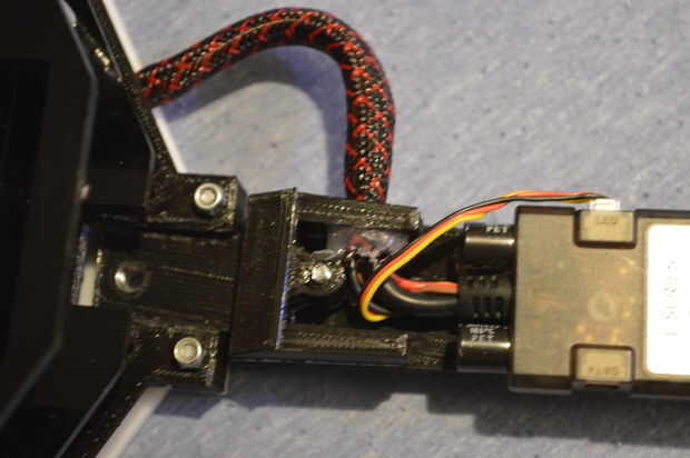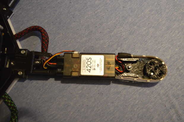 El cableado para esto es apretado. Muy apretado. Usé dos PDBs entre las capas superior e inferior parte inferior. Principal conecta el ESCs y FC a la batería, y hay un voltaje de 12V paso descendente a la segunda, que alimenta cualquier conexión cardán etc. y las luces en cada brazo. En la última foto puedes ver cómo todo lo alambré. Tuve una JST entre los dos PDBs actuando como un interruptor, JST otro tapón en el PDB principal al poder la FC y un tercero en el PDB secundario para cualquier conexión cardán. Para los cables en los brazos, tienes que enhebrar el alambre que envuelve a través de la parte llamada WireSleeving y luego a través del orificio en el E310-WireStandoff y luego trabajar los cables a través de él. Tienes 2 cables de alimentación del LED va en el brazo y dos cables de alimentación de salida más grandes y el cable de señal ESC va en el centro del marco. Tómese su tiempo en esta parte, es difícil. Me pareció la mejor manera de poner la manga a través de la parte llamada WireSleeving y luego poner los cables aunque el agujero en el E310-WireStandoff entonces a través de la manga y la parte llamada WireSleeving. Trabajar las piezas en sus lugares correctos. Debe quitar los cables de servo del enchufe del servo, como que no caben por los agujeros. Para ello, levantar la aleta pequeña de plástico que mantiene el extremo de metal de resbalamiento. Que a los tres y luego metal final de cinta los tres juntos para hacer que una pieza pequeña que es fácil de guiar a través de los orificios y las fundas de cable. Ambos extremos con hotglue, habrá alrededor de 1,5 cm de cable entre el ESC y el agujero en el E310-WireStandoff. Ruta el LED los cables y el cable del LED E310 bajo el ESC en el canal pequeño en el brazo hizo para él. Superglued en que canal tan bajos como sea posible y ponerlos de 2mm de espuma de doble faz para asegurar los CES a. El cable de LED de ESC pasa por uno de los agujeros de 3mm y se muestra en la imagen de arriba. Para caber a través de, tienes que poner el LED en la parte inferior (se muestra en la imagen, asegura con la cinta de espuma de 2mm,) y luego quitar el metal termina de los enchufes temporalmente como se hizo con los cables de servo. Alimentación a través del agujero y ellos colocar la clavija en (comprueba que tienes el orden de conexión correcto.) Luego ruta a través del canal, pegamento en su lugar, luego pegar la ESC y enchufe en. Todo metiendo los puntos para todos estos esquemas de alambre es complicado, tomar una buena cantidad de tiempo, así que esperan pasar unas horas en él y trate de no frustrarse demasiado!