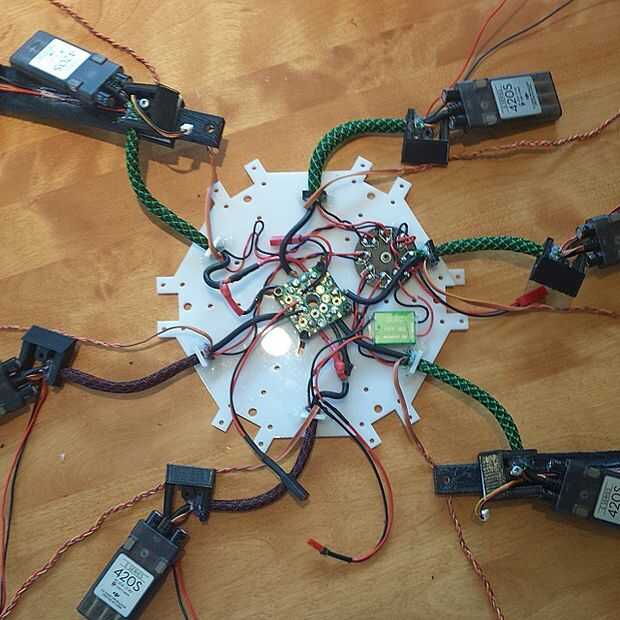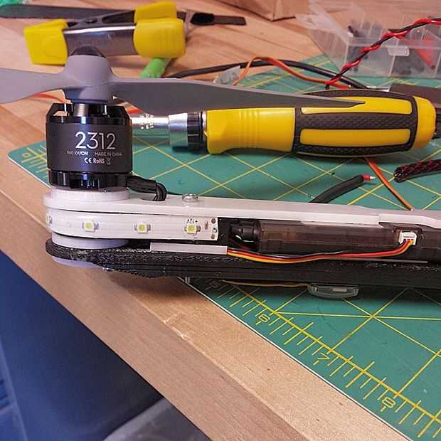 Los tornillos de 20mm conectan las capas de la parte inferior del centro del marco. Dos de los tornillos de 25mm entran a través del brazo, MotorStandoff y ESCCover, 19mm los agujeros de los motores de montaje. Utilizar dos de los más pequeños tornillos de la caja que viene con el kit E310 y Monte a través de la ESCCover a lo 16mm los agujeros del motor de montaje. De esta manera el motor es asegurada a la ESCCover y entonces fijada a la parte delantera del brazo, así. Los tornillos de 30mm pasan por los dos agujeros en los brazos y luego ir a través de la WireStandoff E310 o E310-LEDStandoff. Asegúrese de que los soportes queden al ras con el brazo y no hay ningún espacio entre ellos después de atornillar los tornillos de 30mm en. Yo presionada los separadores con abrazaderas de 15lb mientras que atornilla los pulg (Nota: en la mía, los separadores tienen una parte impresa en 3D y un láser de corte parte. Esto es porque originalmente hice el diseño muy corto y era más rápido cortar piezas planas de la parte inferior de los separadores que al reimprimir 18 piezas. Los diseños han sido fijados a proporcionar a esa altura los separadores sin partes lasercut.) Los tornillos de 35mm hacen las bisagras entre los brazos y el centro del cuerpo. Los tornillos van a través de la parte inferior del cuerpo y el brazo cuando está desplegado para el vuelo. Si necesita visualizar donde todo va en esto hay un modelo de todo montado en mi perfil Tinkercad. Sólo tenga en cuenta que se compone de 100 k + formas geométricas agrupados y reformado y malla de una y otra vez que tendrá un poco blanco para cargar correctamente.