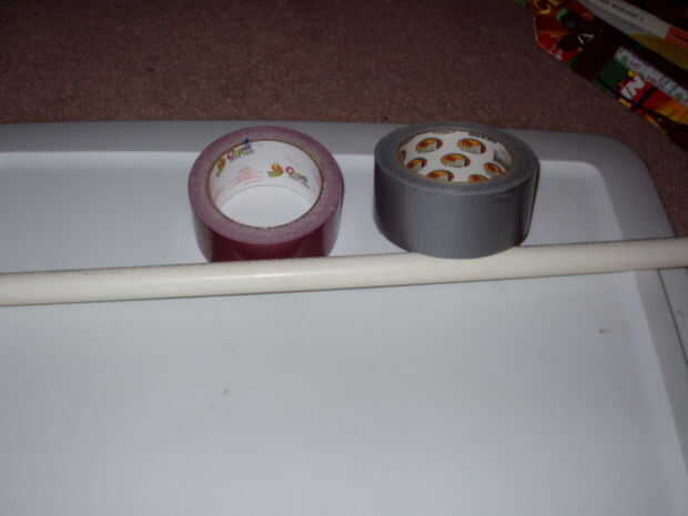 Usted necesita:CINTA PARA DUCTOSCINTA ELÉCTRICACARTÓN DELGADO (O PAPEL, UTILICÉ UNA CAJA DE PIZZA CONGELADA)17 PULGADAS DE TUBO DE PVC DE 3/4 PULGADAS Y 10 PULGADAS DE TUBO DE 3/4 DE PULGADA FREGADERO(EL TUBO DEL FREGADERO DEBE DESLIZARSE SOBRE EL PV