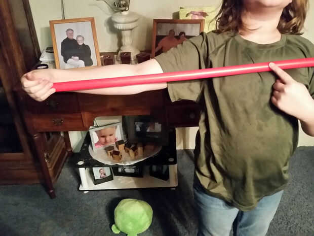 b. para un sable de hoja doble decidido cómo altura desea para ser. Más pentagramas son de nivel de los ojos a la altura justo sobre la cabeza. Con una cinta métrica determinar altura. Una vez creada su mango puede medirlo y restar ese número forma la altura deseada, dividir eso por dos y es cuánto tiempo cada hoja será.